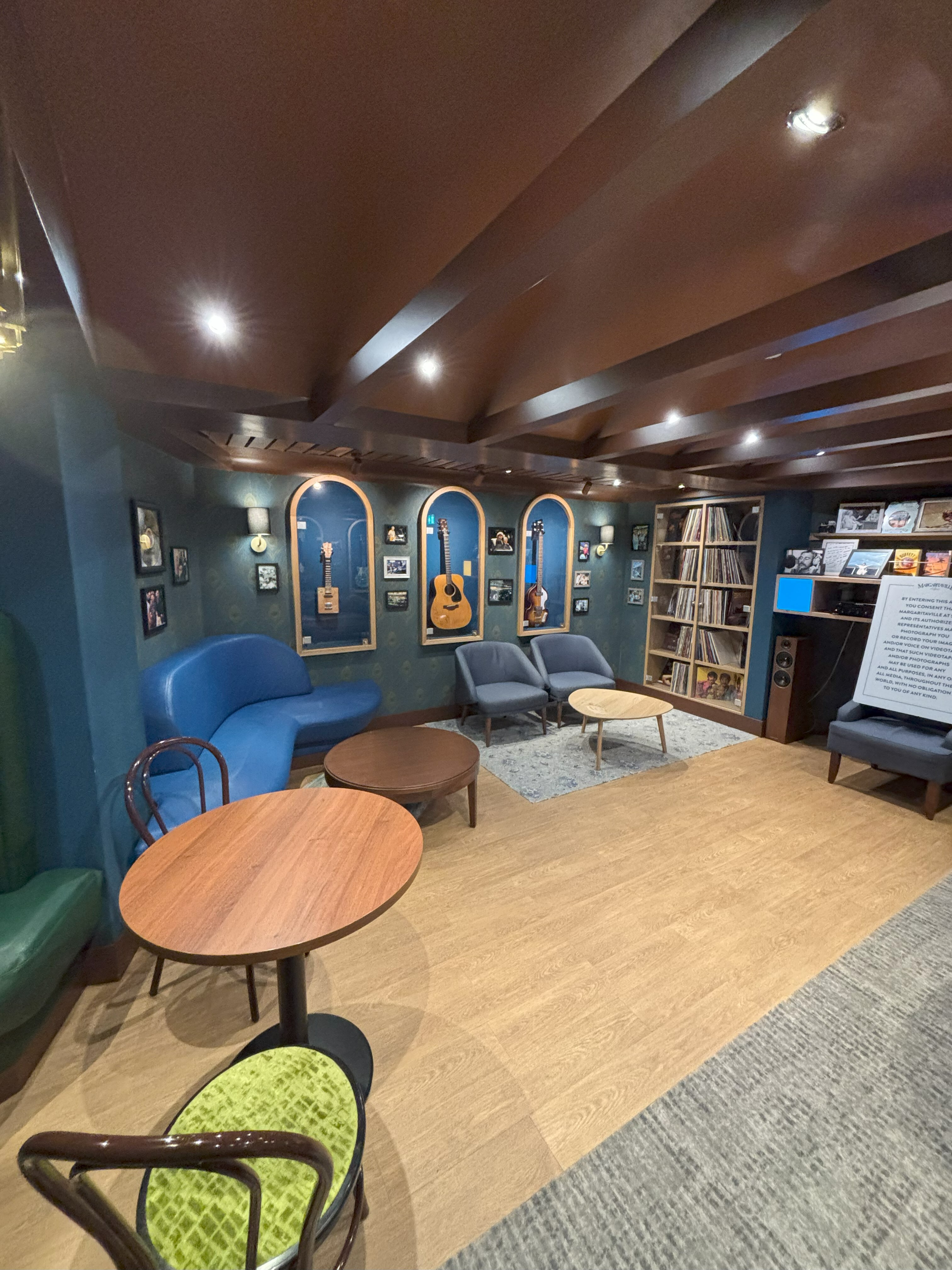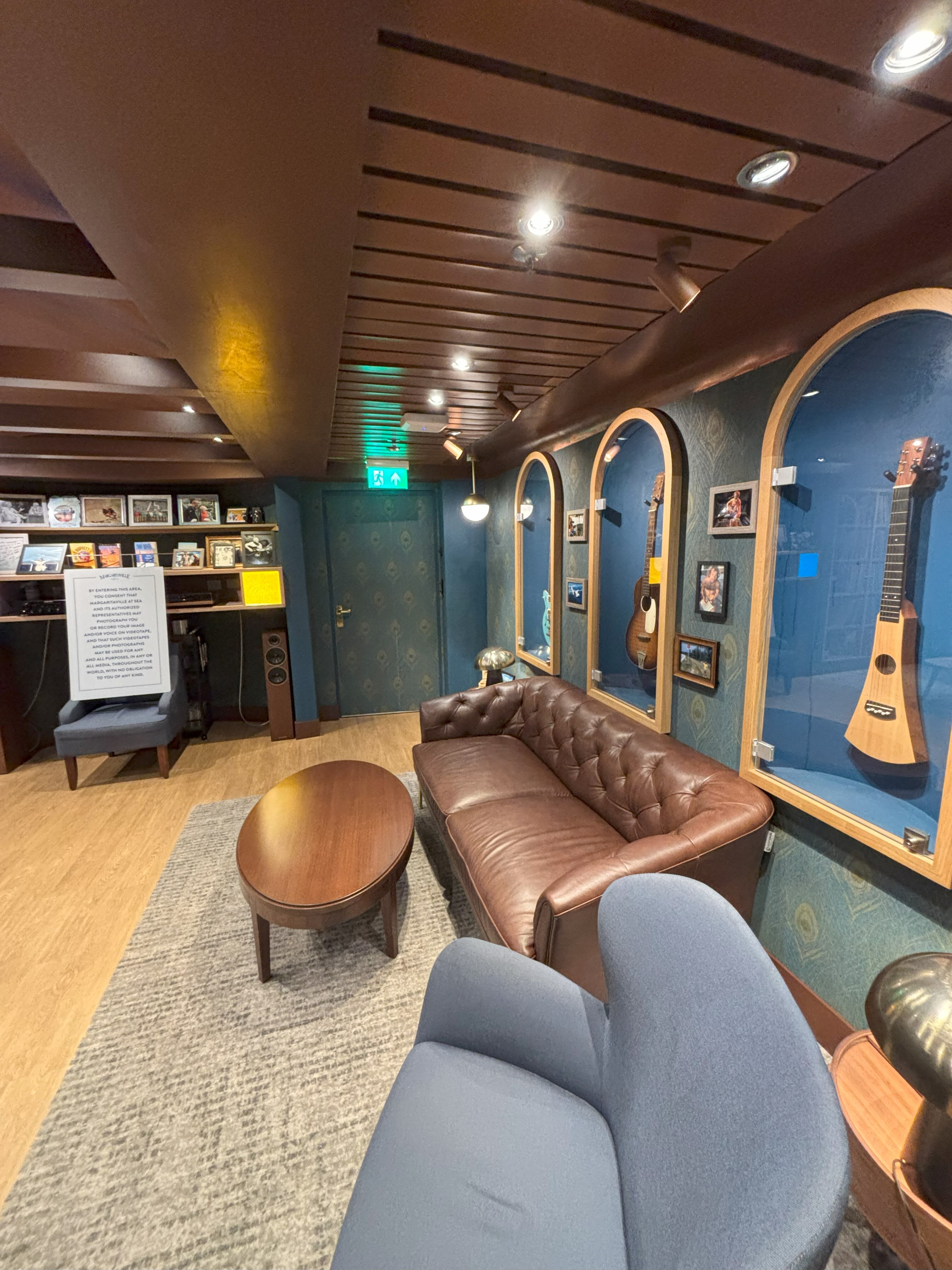 Now, if you want to take your cruise to legendary status, you've got to find your way into QMN—Quietly Making Noise. It's not on the map and it is an additional charge experience. It’s a secret speakeasy-style lounge decked out with exclusive Jimmy Buffett memorabilia, including his first acoustic guitar. With a Buffett historian spinning tales and craft cocktails you won’t find anywhere else.