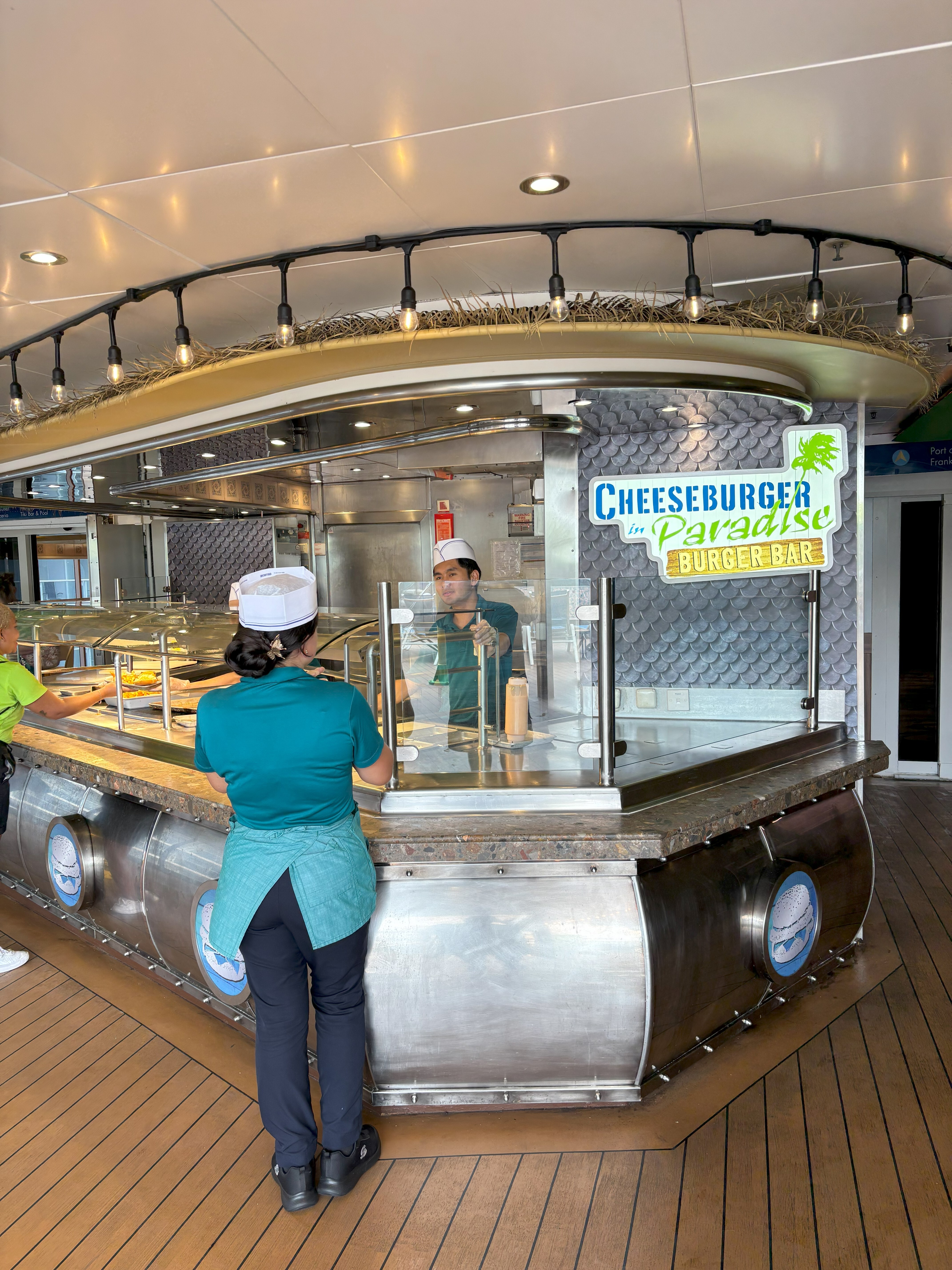 Now, let’s talk food. Overall, it was solid—not five-star gourmet, but good and satisfying. And hey, I didn’t come aboard looking for fine dining and white tablecloths—I came for cheeseburgers in paradise, and that’s exactly what I got. The Cheeseburger in Paradise Burger Bar was THE SPOT for lunch. Juicy burgers, crispy fries, and that signature laid-back flair. I may or may not have eaten there more than once a day (don’t judge).